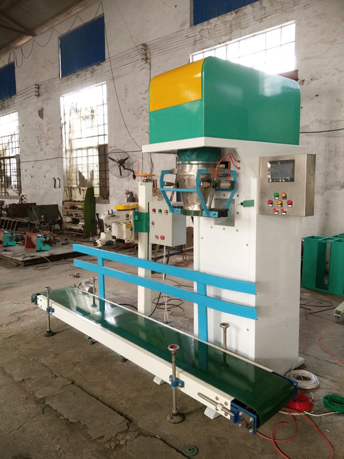 該系列定量包裝機(jī)組專為各類粉狀物料和小顆粒狀物料的定量包裝而設(shè)計(jì),采用雙螺旋(快中慢三速)給料方式,通過傳感器控制變頻器使電機(jī)帶動螺旋,分級給料到包裝袋內(nèi)。當(dāng)包裝袋內(nèi)物料充填到設(shè)定的重量后,螺旋停止給料。夾袋器自動打開,料袋通過輸送帶送走,由人工輔助縫包(封口)。
