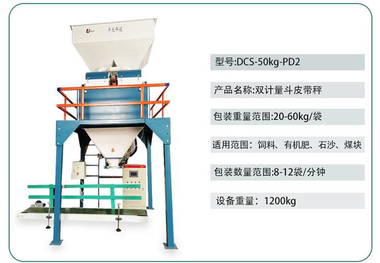 DCS-50kg-PD2型皮帶(雙斗)定量包裝機,該機主要由加料裝置、自動稱重裝置,輸送裝置,縫包裝置,電腦控制等五大部分組成。具有結構合理,造型美觀,運行平穩(wěn),節(jié)能省電,操作方便,稱重準確、速度快的特點。